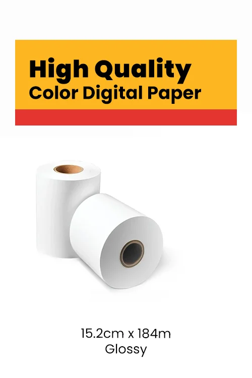 Profesjonalny papier fotograficzny High Quality DIGITAL PAPER 15.2 cm x 184 m Glossy do procesu mokrego (RA-4). Gramatura 225 g/m², wysoka biel, znakomita kolorystyka. Kompatybilny z maszynami typu Fuji Frontier, Noritsu, Kodak.